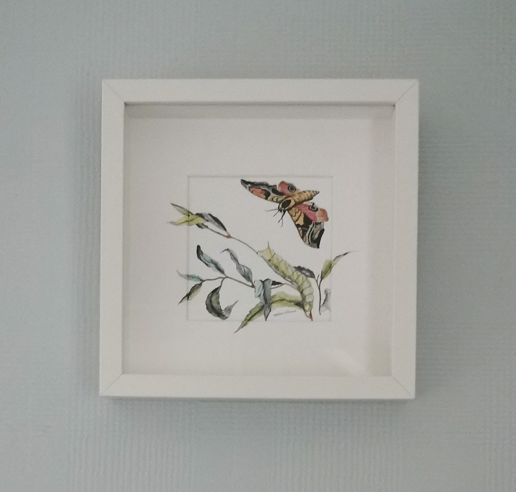 Detailed original pen/ink/watercolour of The Eyed Hawk Moth in white box frame 25cm x 25cm